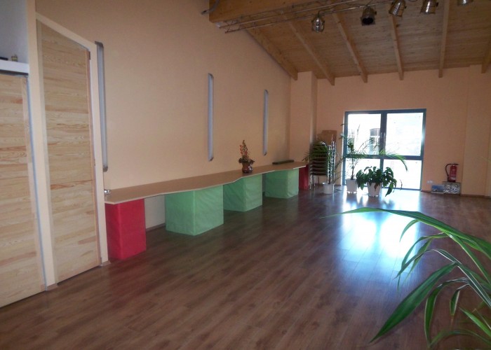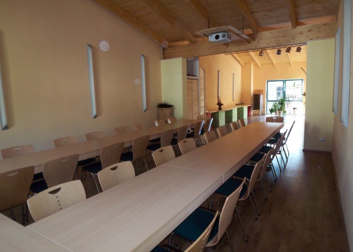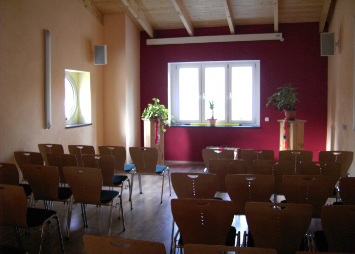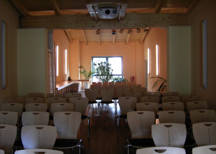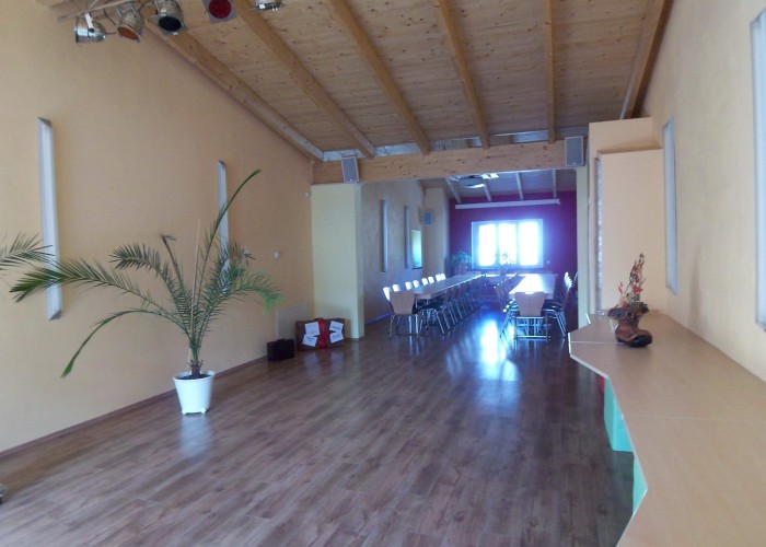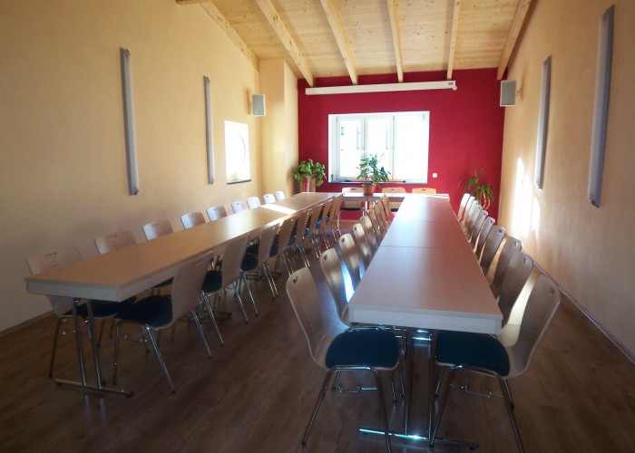 Im Obergeschoss finden Sie einen, in warmen Tönen gehaltenen, hellen und geräumigen Veranstaltungssaal mit offenem Blick auf die Deckenbalken und den Laminatboden. Reihenbestuhlung sowie Tischbestuhlung für max. 60 Personen bieten sich für diverse Veranstaltungen an. Dimmbare Beleuchtung und Platz für ein Buffet runden das Bild ab.